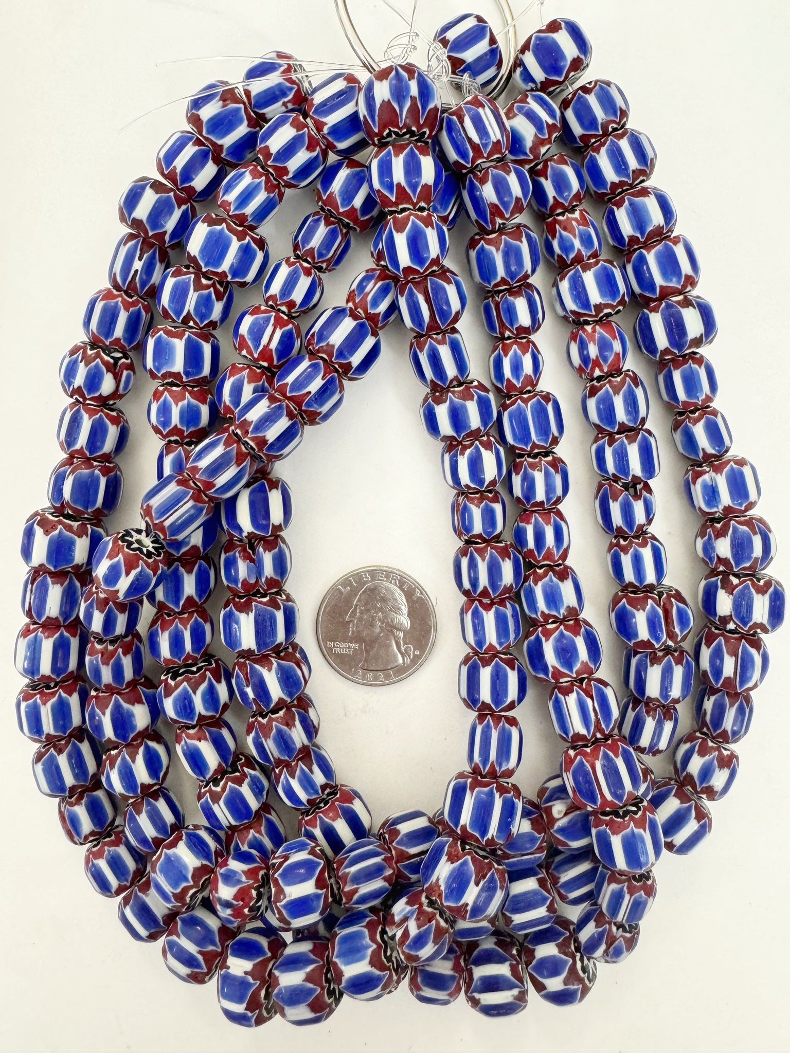 red white blue black chevron motif, vintage look glass, 10-15mm rondelle mix, 15" strand, sold per strand