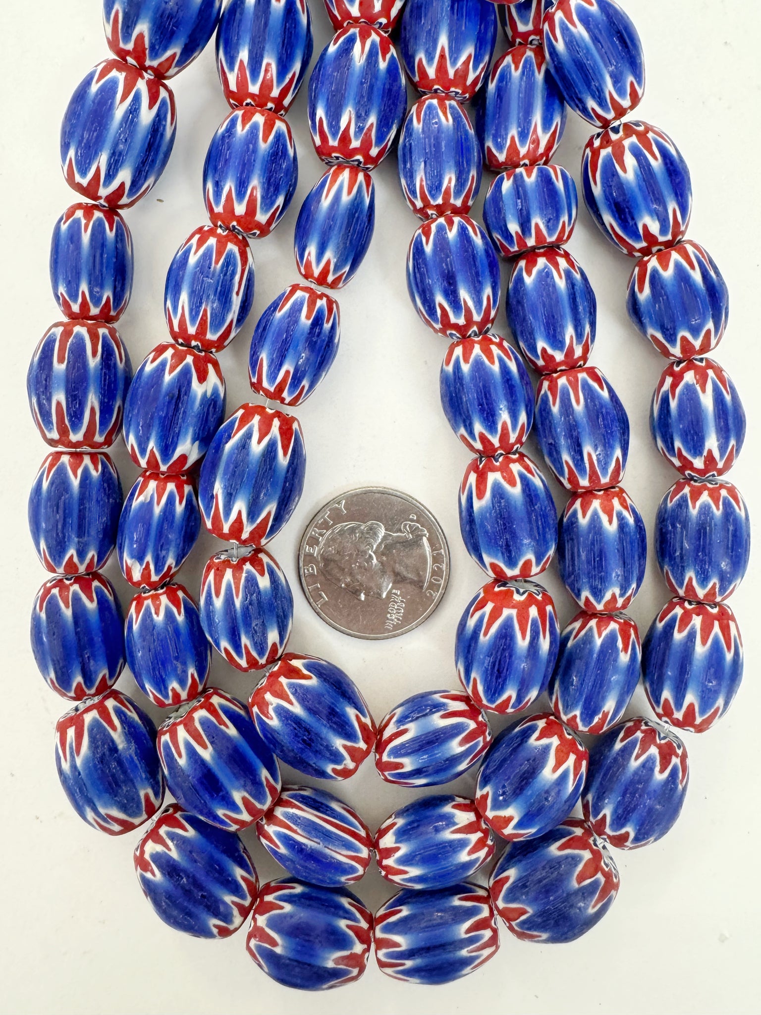 red white blue black chevron motif, vintage look glass, 18x14mm barrel mix, 15" strand, sold per strand