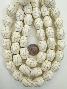 off white pale dark blue crackle, vintage look resin, 21x17mm bicone barrel, 15" strand, sold per strand