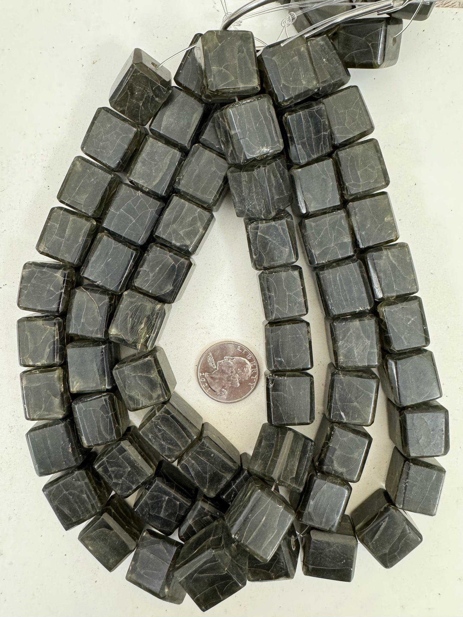 very dark olive green crackle motif, vintage look resin, 18x17x17mm cube, 15" strand, sold per strand