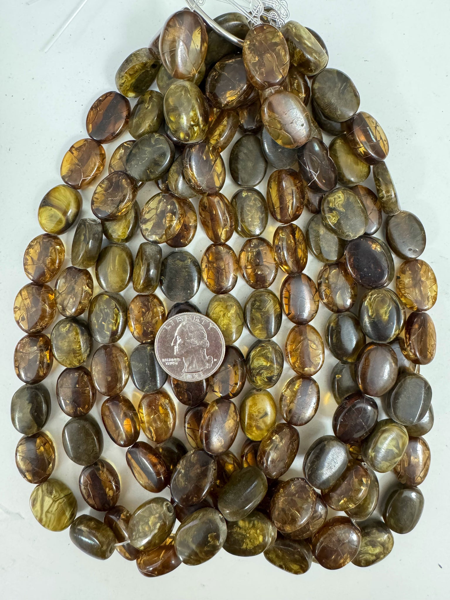 dark crack amber dark mustard yellow mix, vintage look resin, 18x14x6mm oval, 15" strand, sold per strand