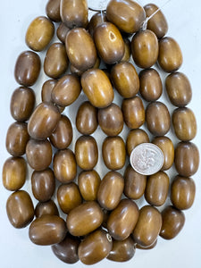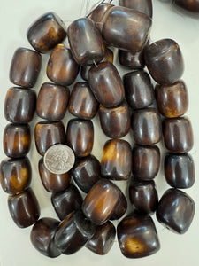dark chocolate brown golden off white, faux bone, vintage look resin, 29x23mm barrel, 15" strand, sold per strand