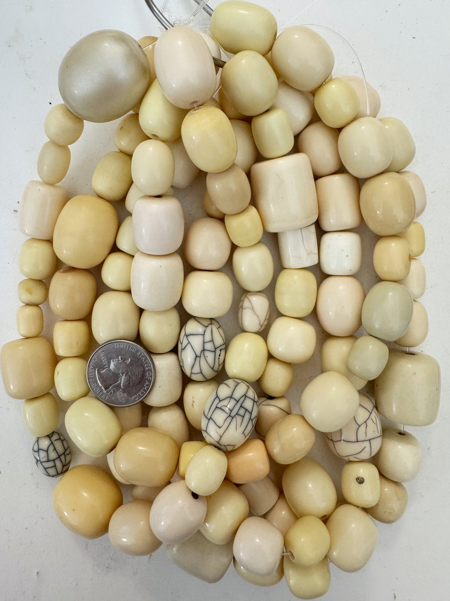 off white barrel mix, faux bone, vintage look resin, 15" strand, sold per strand