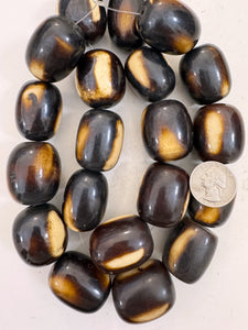 dark chocolate brown off white, faux bone, vintage look resin, 34x29mm barrel mix, 15" strand, sold per strand