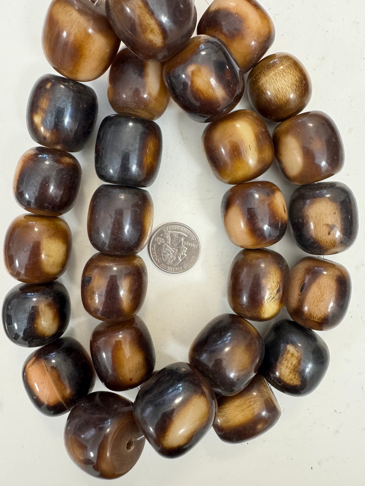 dark chocolate brown golden peach off white, faux bone, vintage look resin, 29x27mm barrel mix, 15" strand, sold per strand