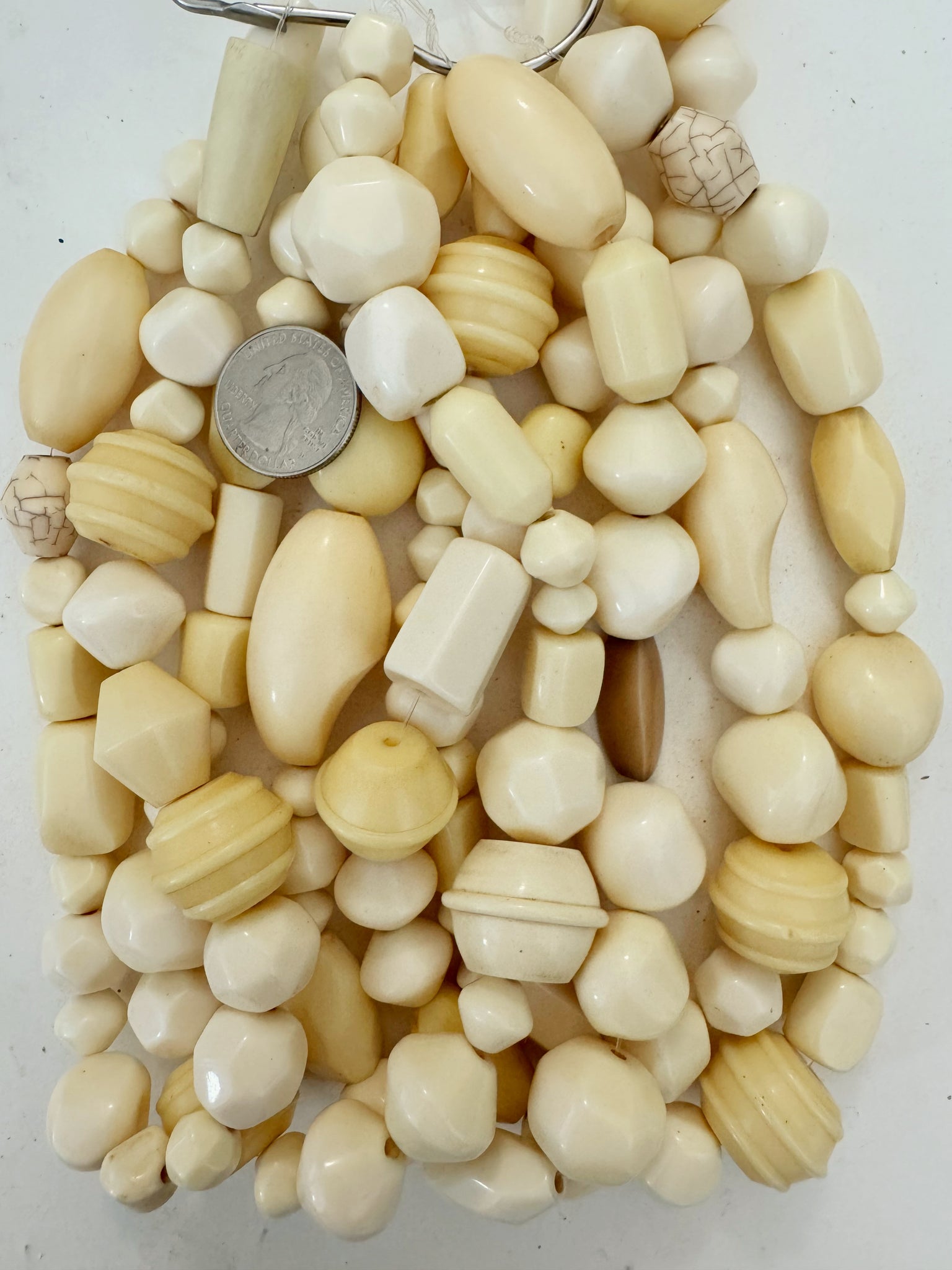 off white carved shape mix, faux bone, vintage look resin, 15" strand, sold per strand