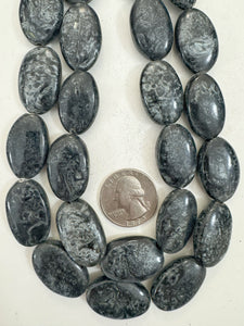 pearly dark blue gray, vintage look resin, 26x16x7mm oval, 15" strand, sold per strand