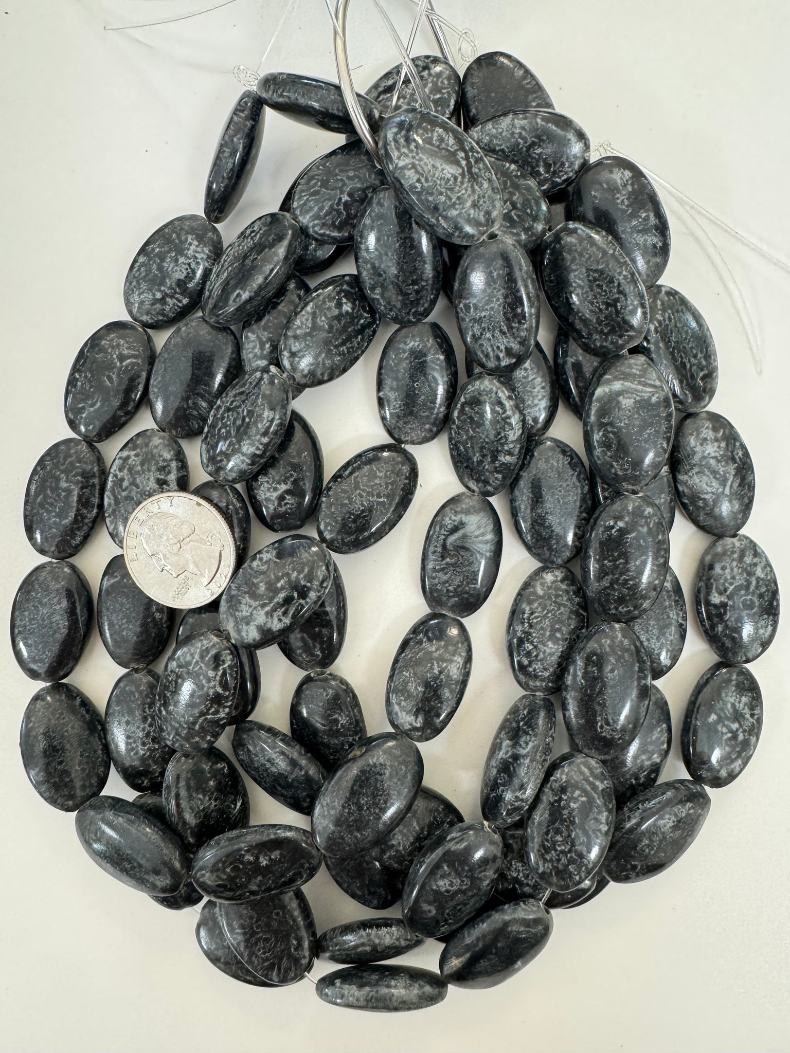 pearly dark blue gray, vintage look resin, 26x16x7mm oval, 15" strand, sold per strand