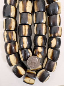dark brown off white carved stripe, faux bone, vintage look resin, 21x20mm barrel, 15" strand, sold per strand