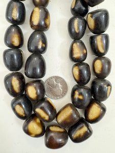 dark chocolate brown off white stripe, faux bone, vintage look resin, 26x23mm barrel, 15" strand, sold per strand