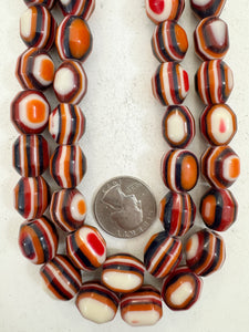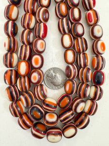 orange black white red stripe, vintage look resin, 20x15mm barrel, 15" strand, sold per strand