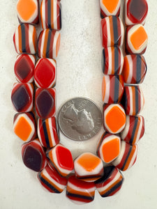 orange black white red stripe, vintage look resin, 14x10x10mm 4 sided corner cut cube, 15" strand, sold per strand