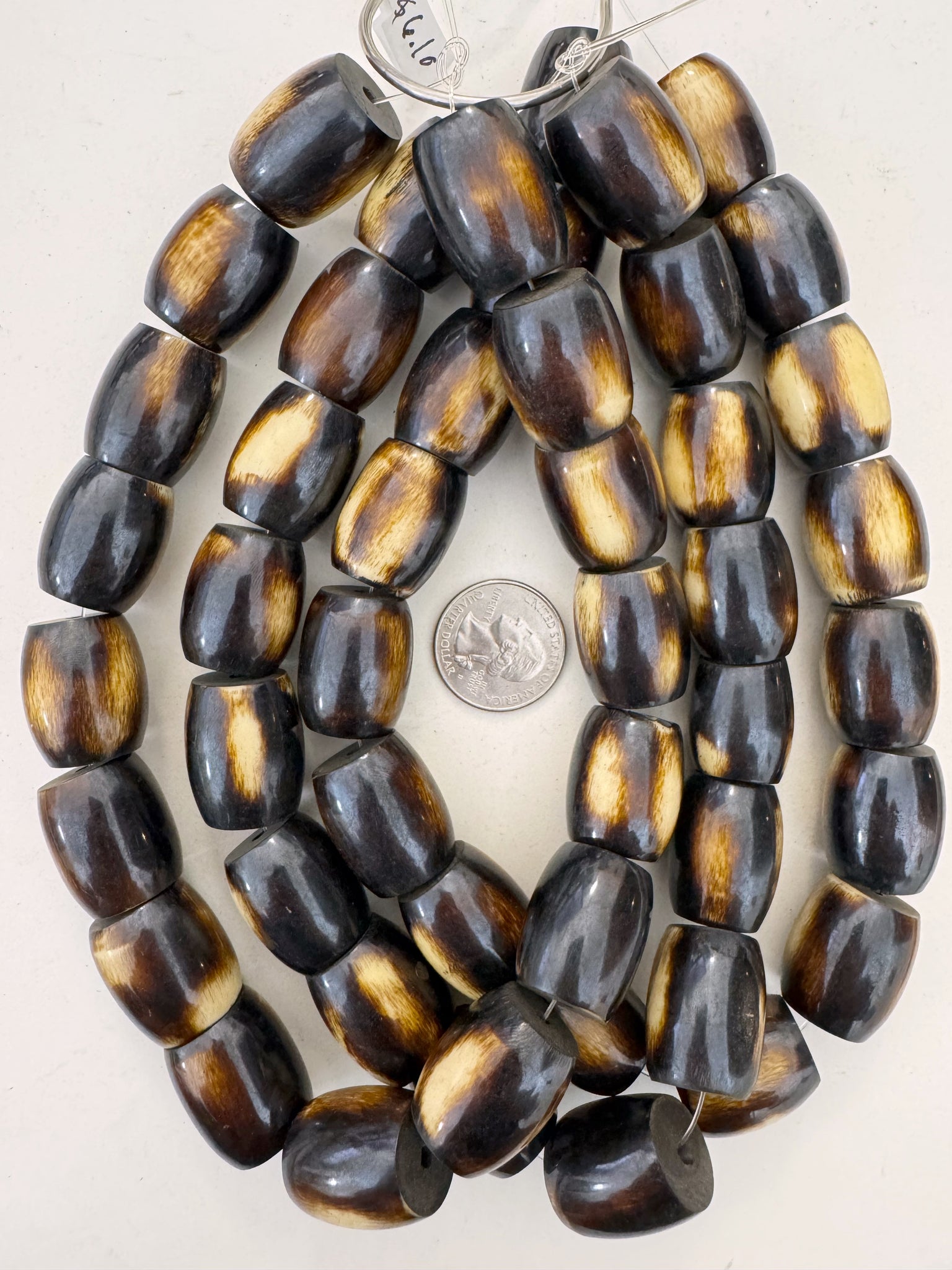 brown off white stripe motif, faux bone, vintage look resin, 23x19mm barrel, 15" strand, sold per strand