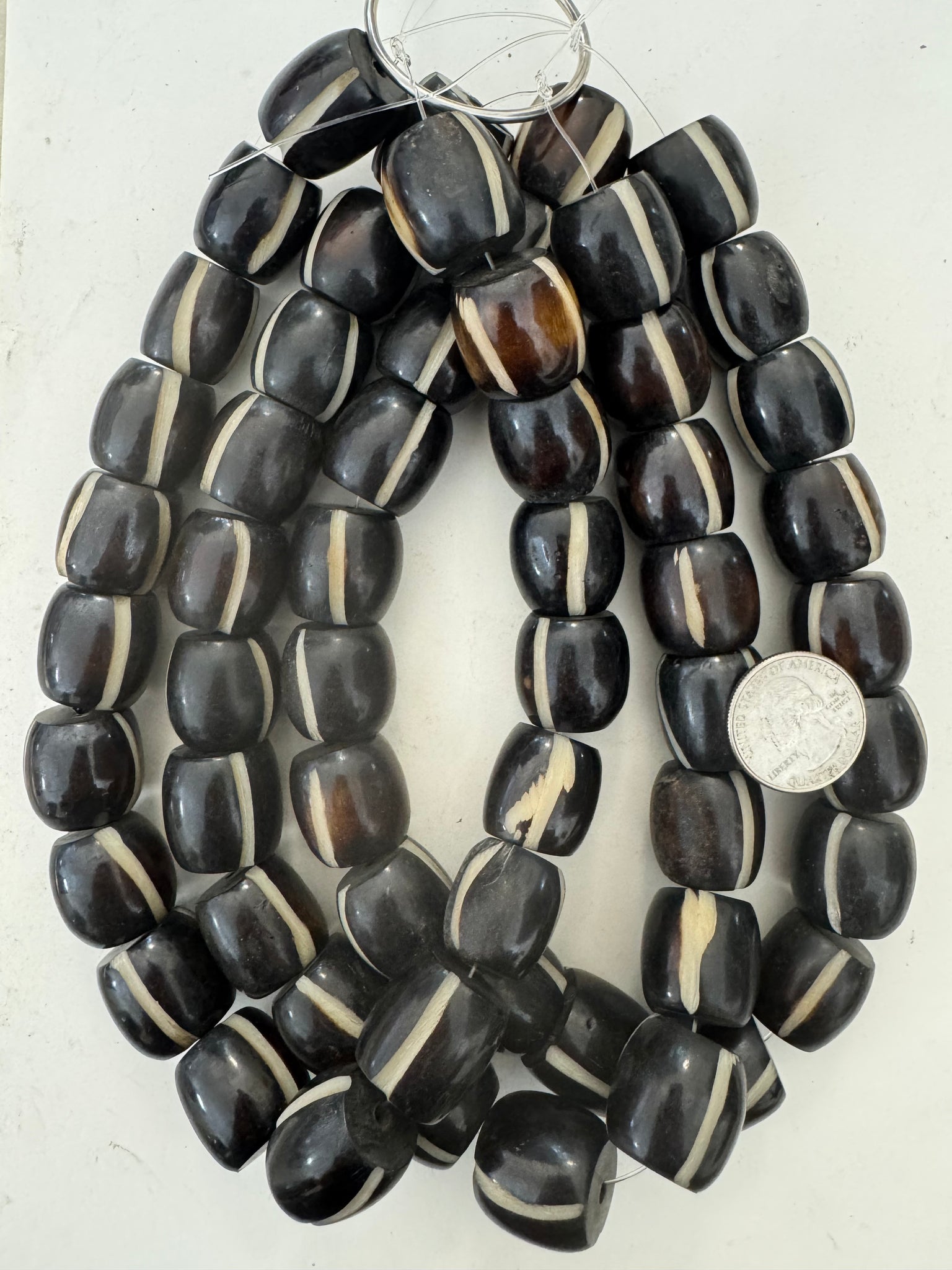 dark brown off white carved stripe, faux bone, vintage look resin, 21x20mm barrel, 15" strand, sold per strand