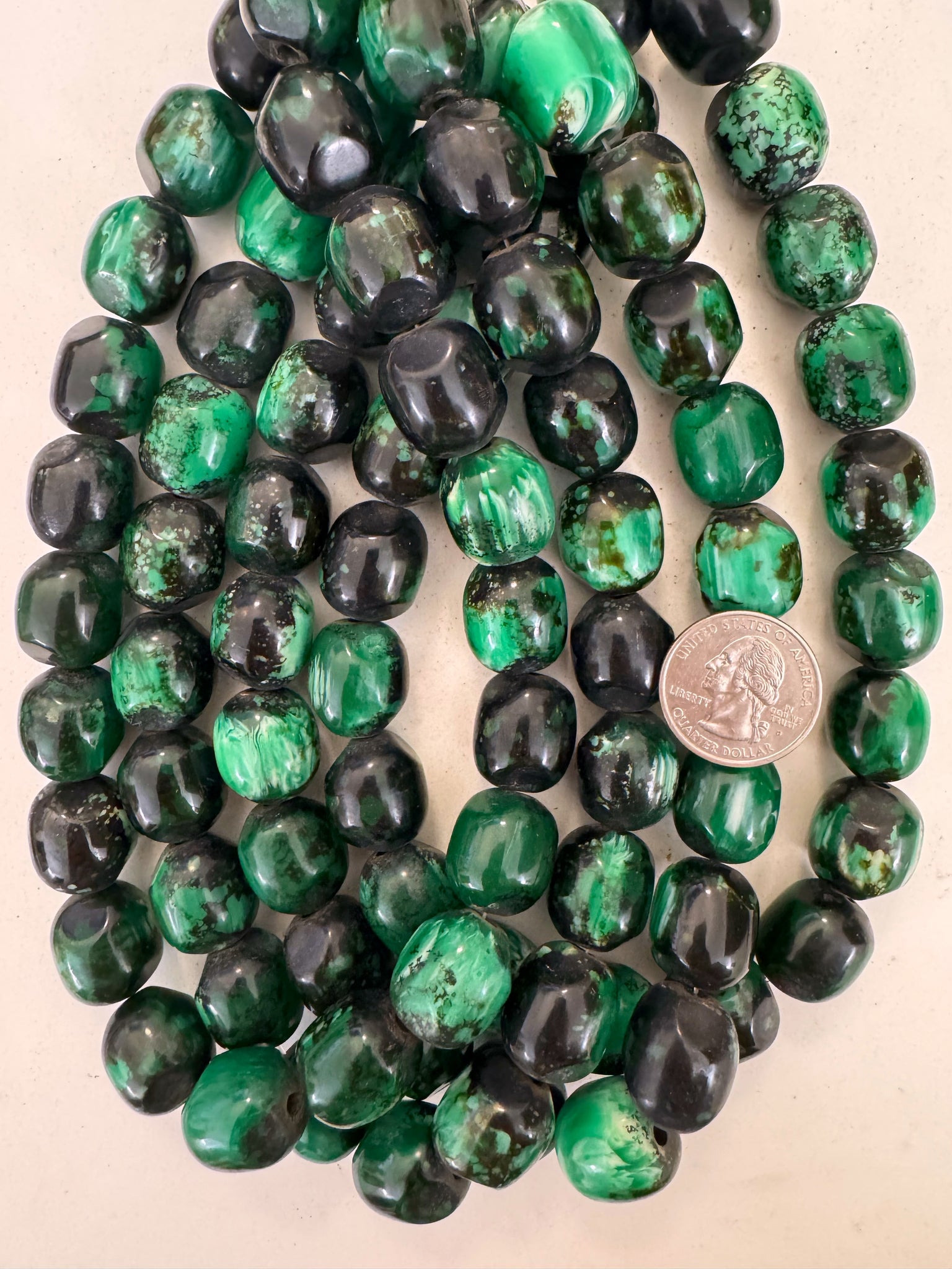 black green white swirl, vintage look resin, 18x17mm nugget barrel, 15" strand, sold per strand