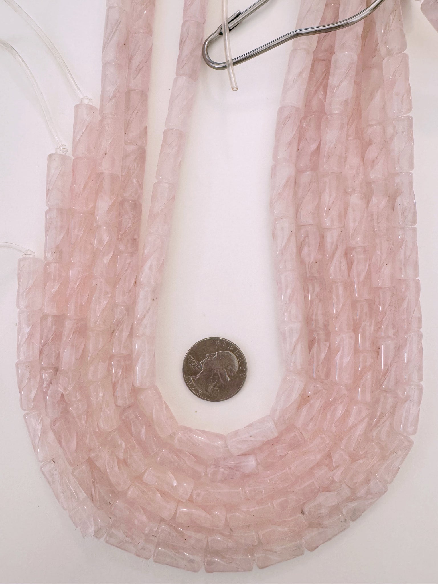 rose quartz, 18x8mm carved twist tube, 15" strand, sold per strand, may have some chipped/broken beads
