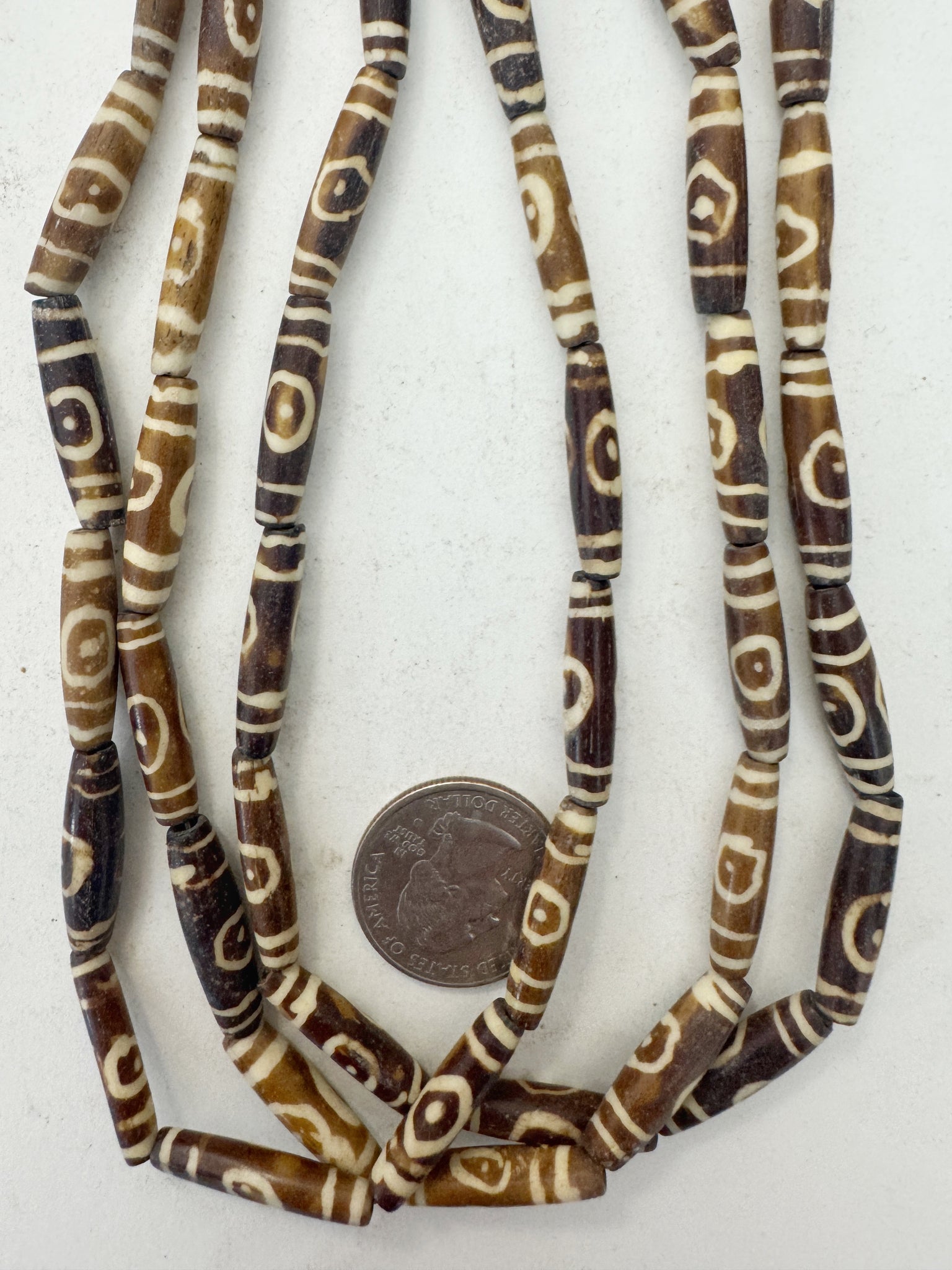 golden brown off white, lines eye motif, vintage stock bone, 24x6mm bowed tube, 15" strand, sold per strand (batch 1)