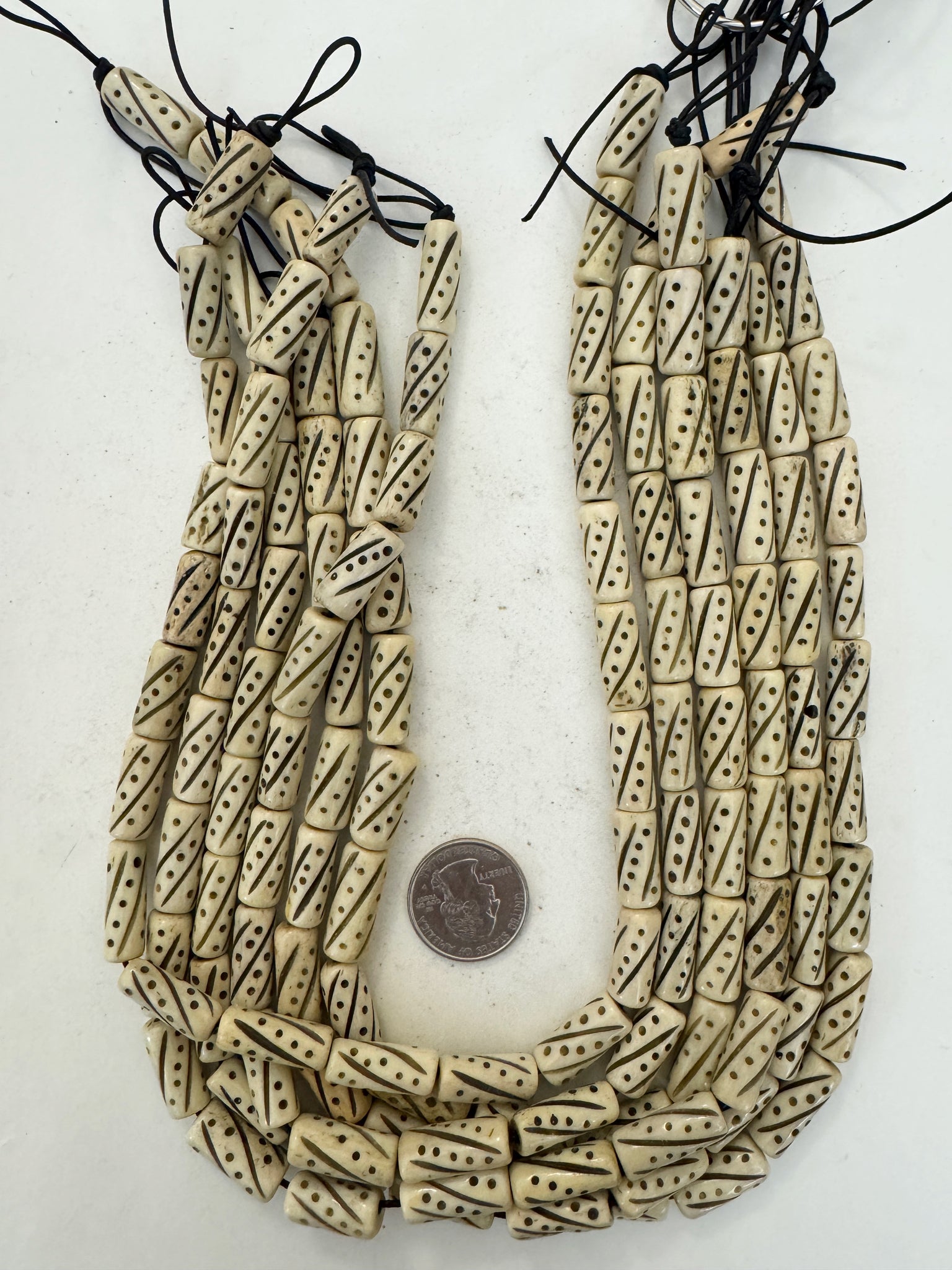 off white, carved dark dots lines motif, vintage stock bone, 21x8mm tube, 15" strand, sold per strand