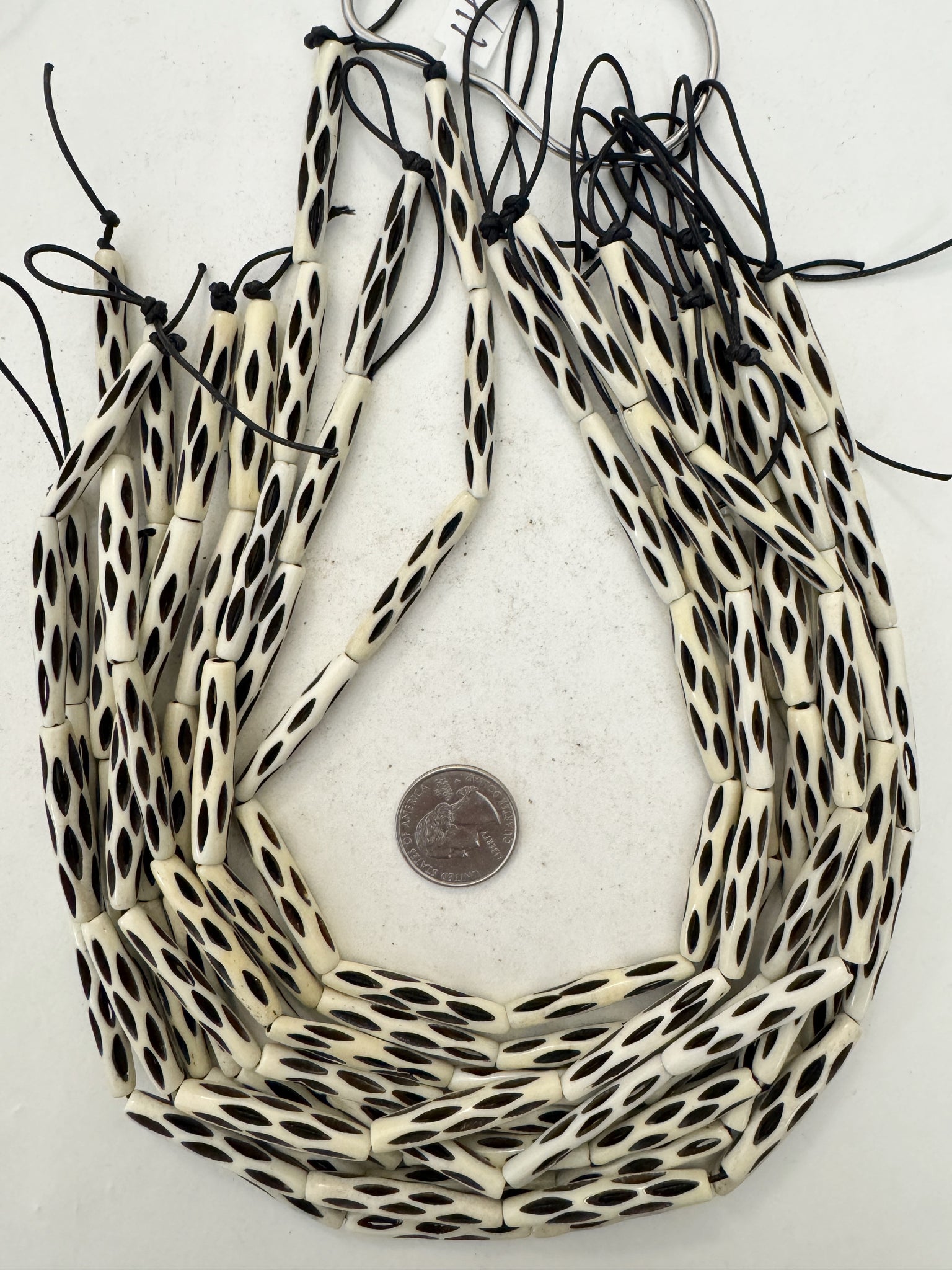 off white, carved repeated dark lines motif, vintage stock bone, 37x6mm tube, 15" strand, sold per strand