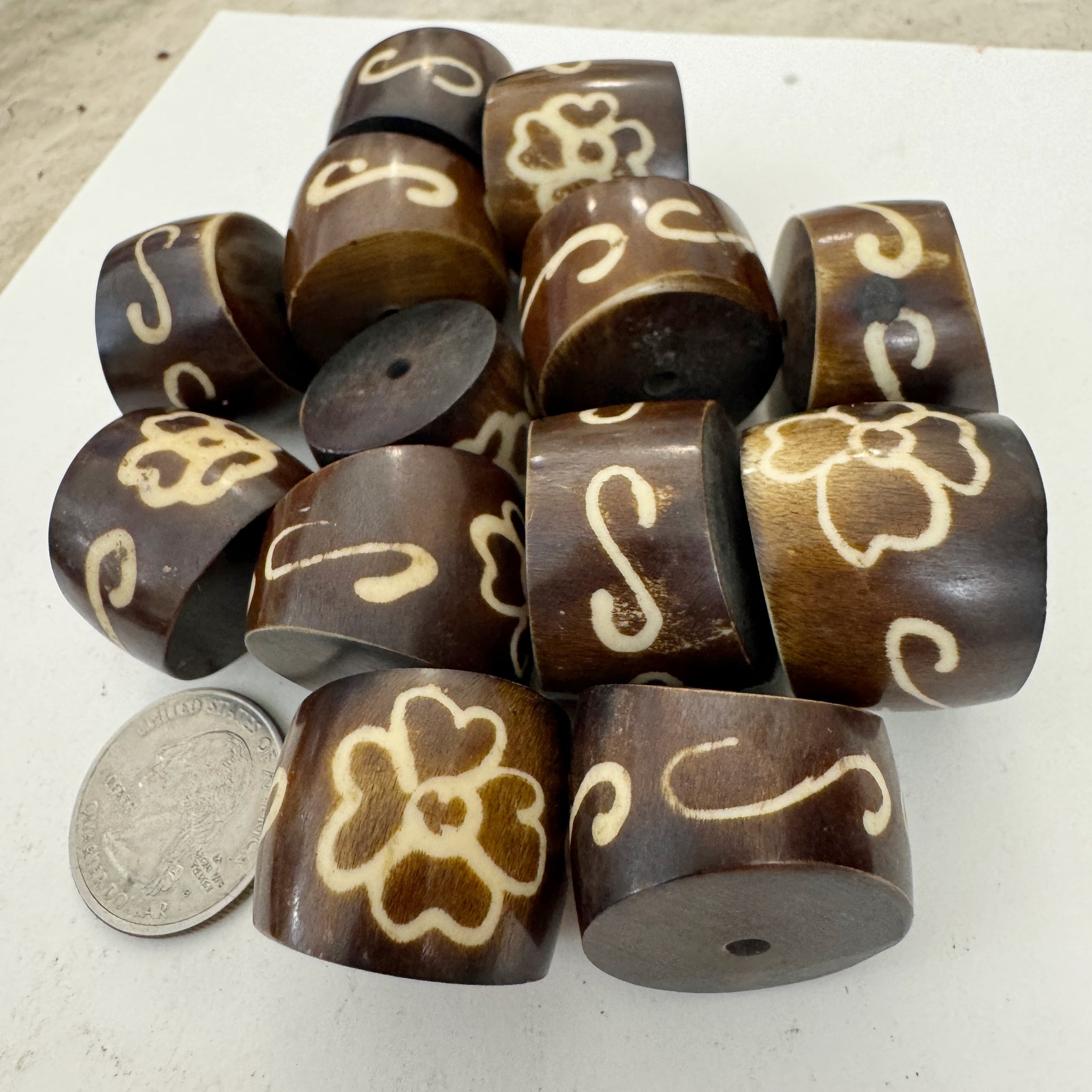 brown off white, floral motif, faux bone look, vintage stock resin, 26x22mm slice rondelle, sold per bead