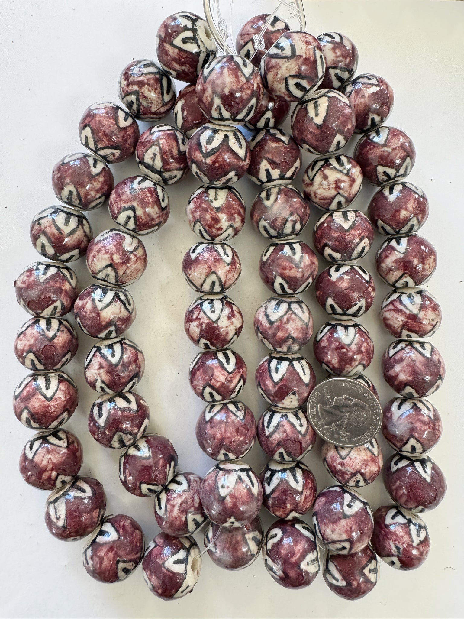 dark pale red purple black off white, hand painted floral motif, vintage stock ceramic, 20mm semi round, 15" strand, sold per strand