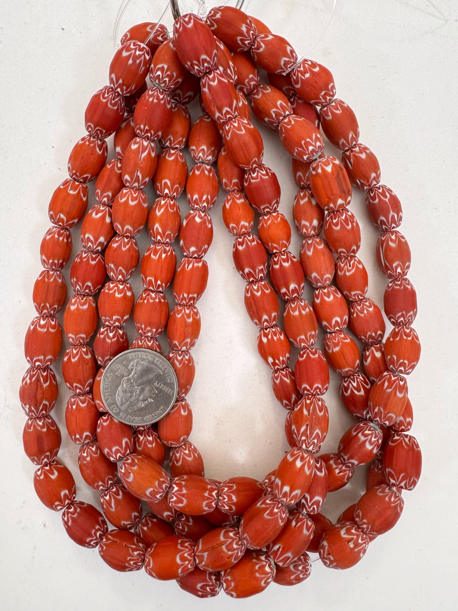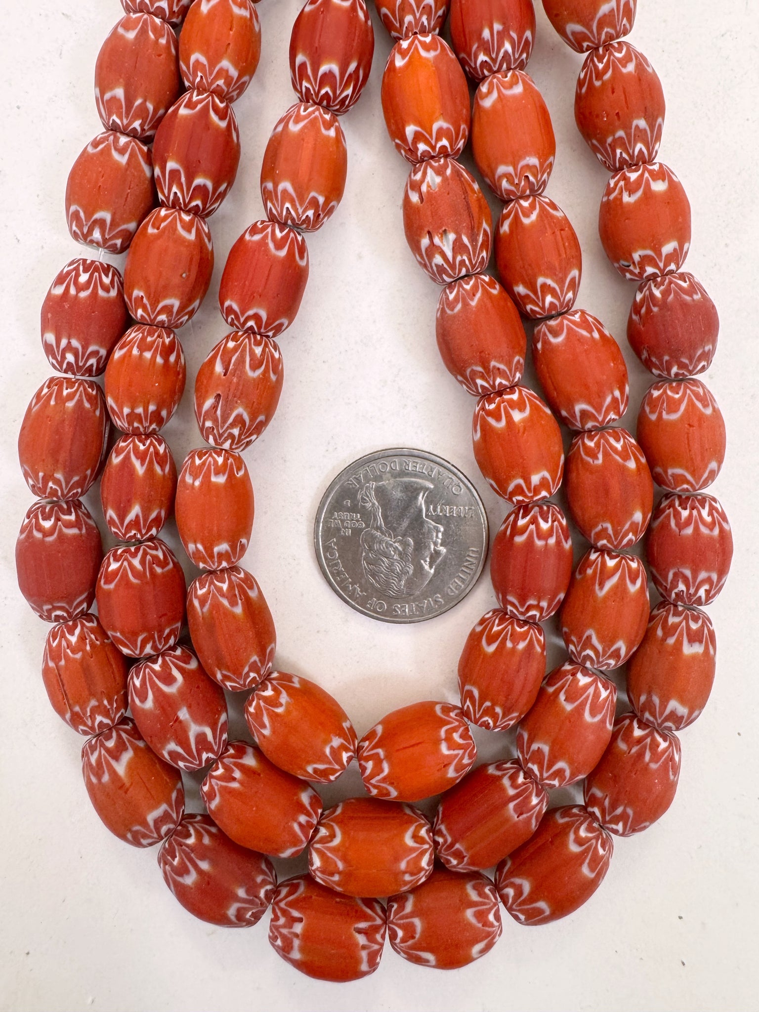 dull finish pale orange white chevron motif, vintage look glass, 16x11mm barrel mix, 15" strand, sold per strand