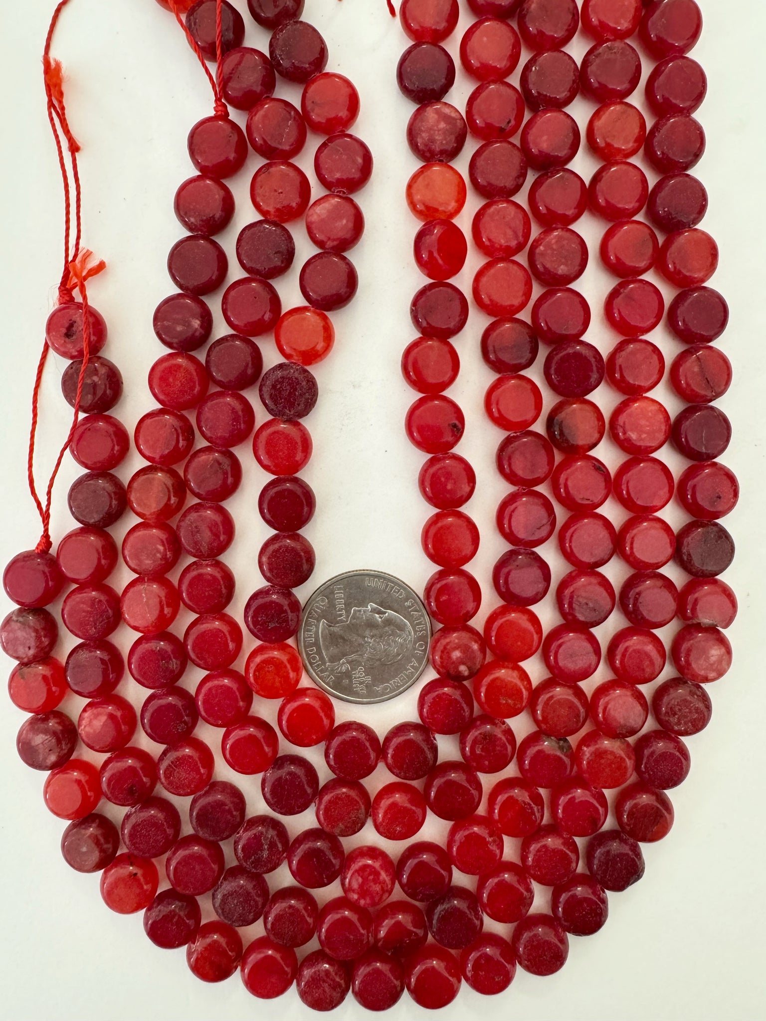 lighter and darker bright red color enhanced quartz, 10x10x6mm coin, 15" strand, sold per strand