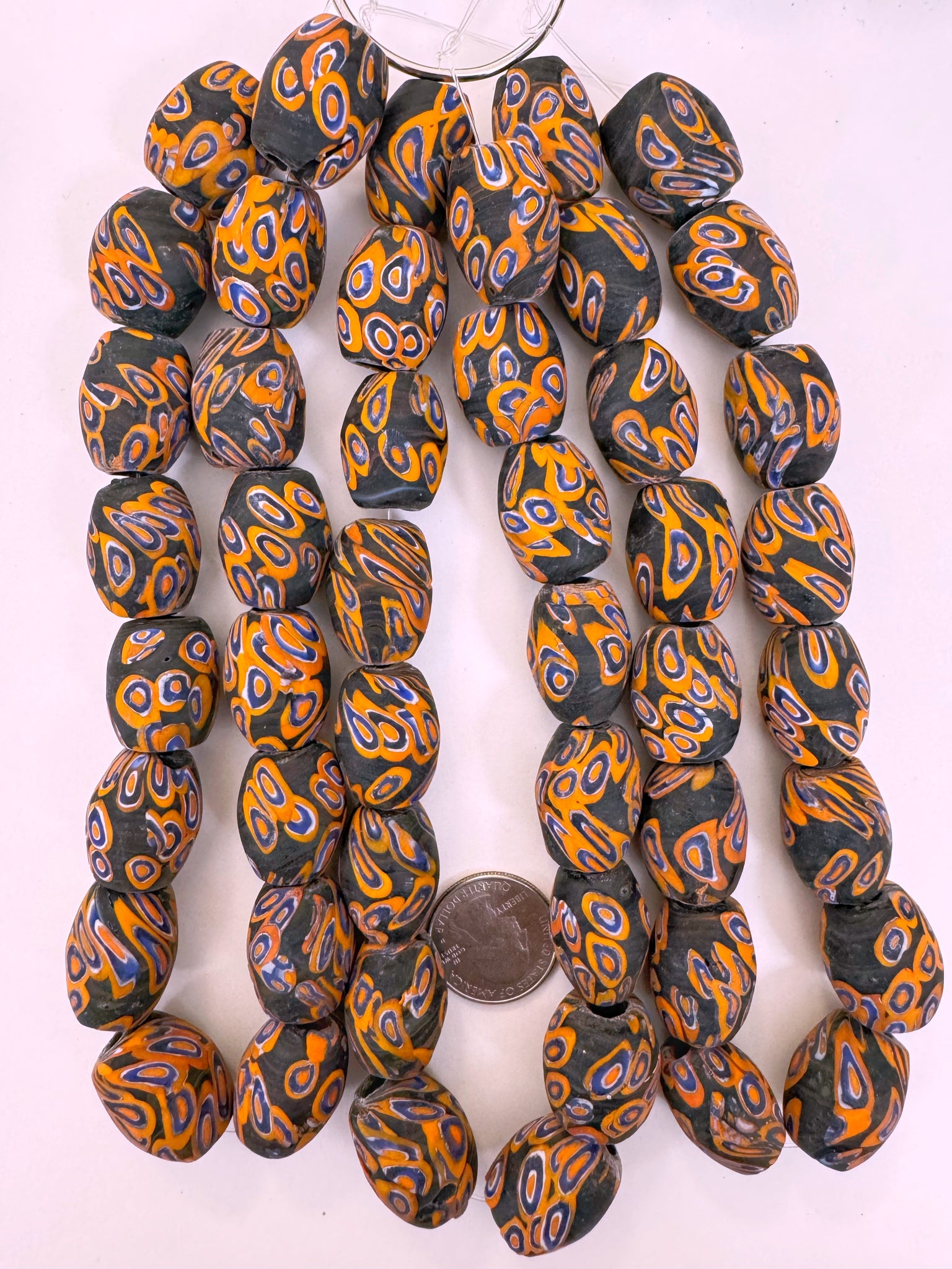 matte orange blue white black millefiori motif, vintage look glass, 24x18mm bowed tube barrel mix, 15" strand, sold per strand