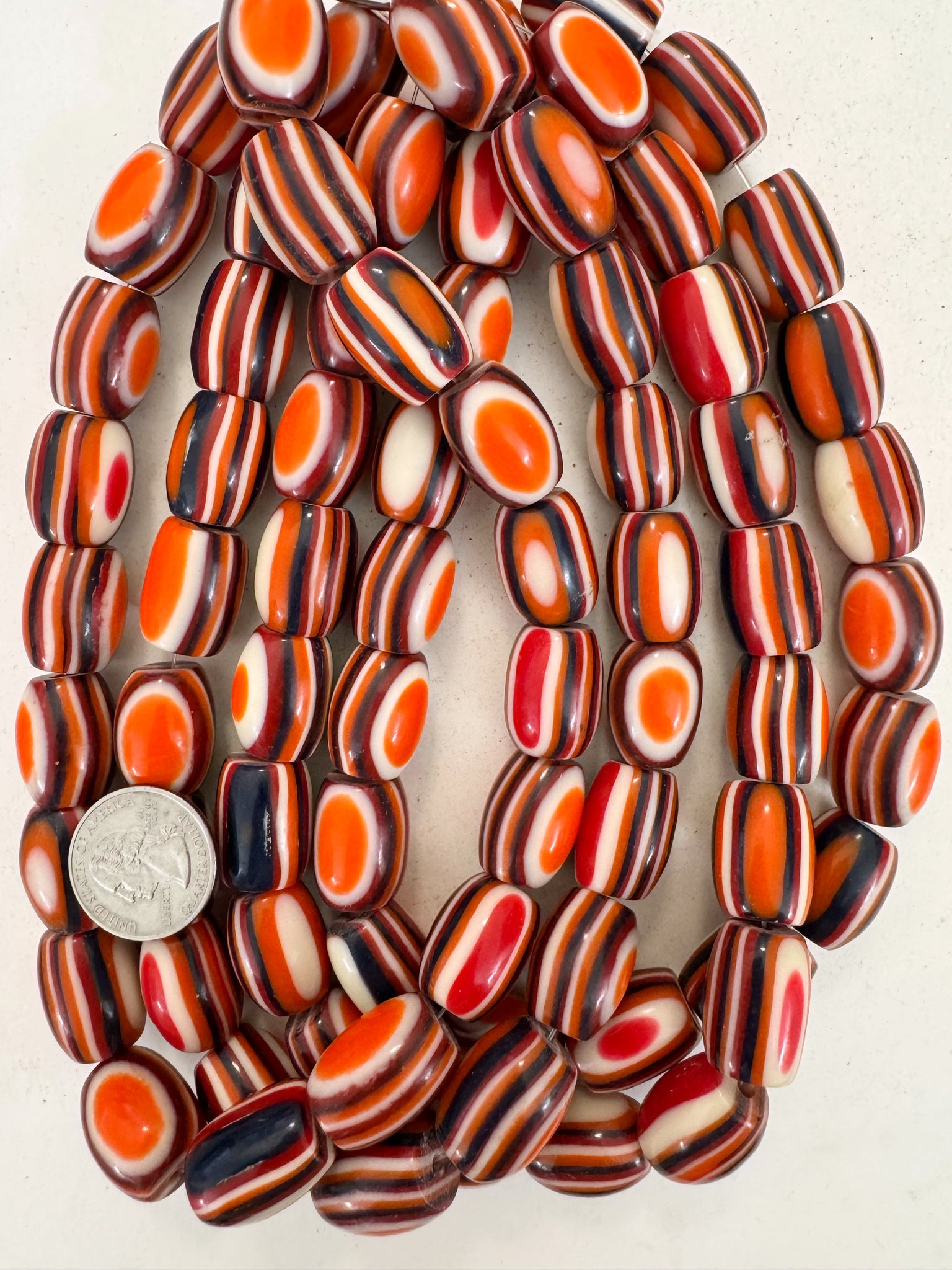 orange black white red stripe, vintage look resin, 20x15mm barrel, 15" strand, sold per strand