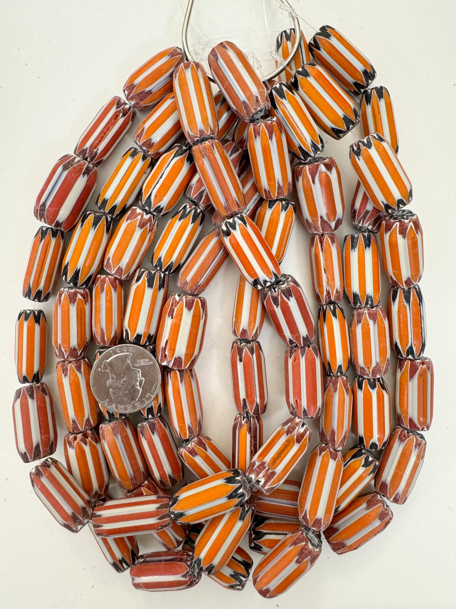 orange red white black chevron motif, old stock vintage glass, 26x13mm tube mix, 15" strand, sold per strand
